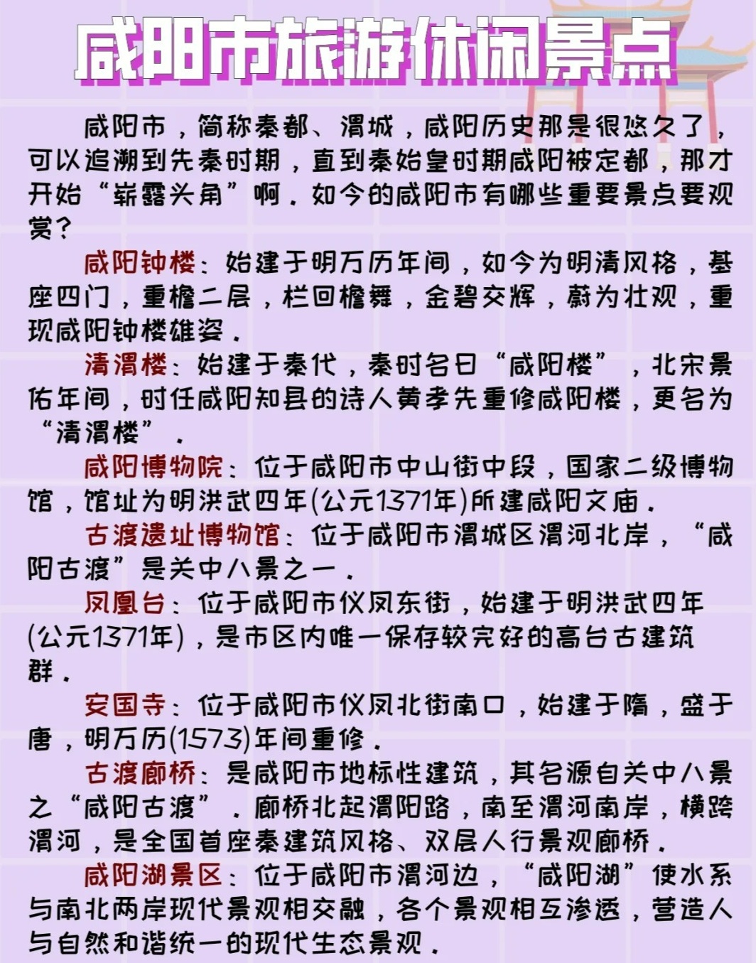 朋友們,咸陽旅游不僅是一次賞心悅目的旅程,更是一次心靈的洗禮、一次成長(zhǎng)的契機(jī),讓我們帶著自信、正能量和幽默感,踏上這段勵(lì)志的咸陽之旅,尋找屬于自己的成長(zhǎng)與輝煌,啟程吧!咸陽旅游正等待著我們?nèi)ヌ剿魑粗氖澜纾?/p>
